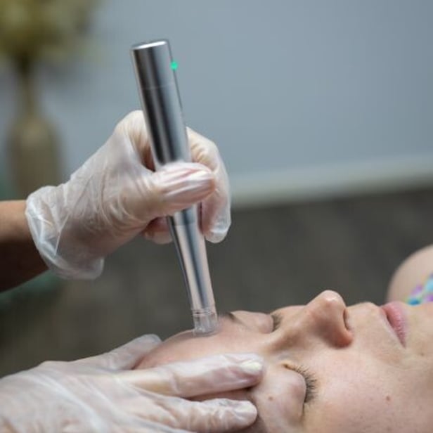 Nano Fusion (or Nano-needling) is a non-invasive, pain-free skincare treatment that uses a specialized, silicone-tipped pen to create thousands of microscopic,, superficial channels in the skin. It boosts serum absorption by up to and stimulates collagen production to improve texture, hydration, and fine lines with no downtime.